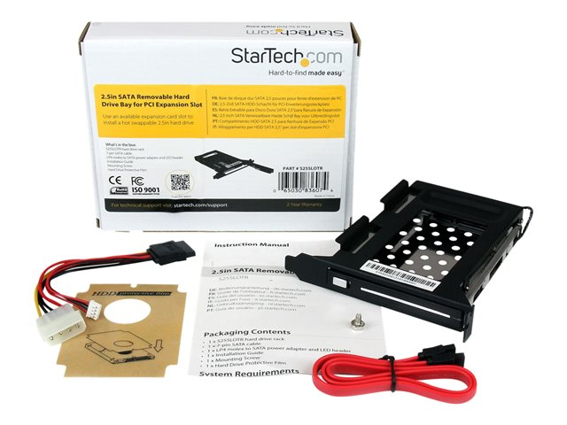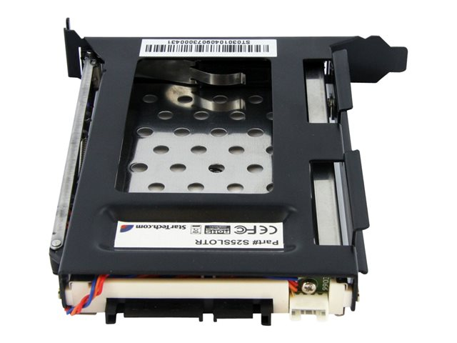 - Information Use an available expansion card slot to install a hot swappable 2.5in hard drive. The S25SLOTR Trayless Hard Drive Rack can be installed into an available (full profile) PCI expansion card slot, providing easy access to a bare 2.5" SATA hard drive or solid state drive (SSD) from the rear panel of a computer case. Unlike conventional hard drive enclosures, the S25SLOTR hard drive rack doesn't require that a drive be installed in a drive tray, saving the time and hassle involved in having to mount or install the hard drive for access to drive contents. To maximize performance and utilize the full speed potential of your SATA III hard drives, this HDD Backplane supports SATA III for transfer speeds up to 6 Gbps when paired with compatible controller. Once installed in a PCI slot (and accompanying rear panel bracket), installing a 2.5" SATA HDD is as simple as inserting it into the trayless rack. To remove the hard drive, simply hit the eject button to unlock the access door, allowing the drive to be pulled out of the computer without having to dismount the drive. This unique design of the mobile rack enables you to use any available full profile expansion slot to mount a removable 2.5in SATA hard drive.