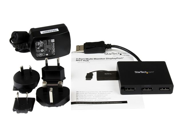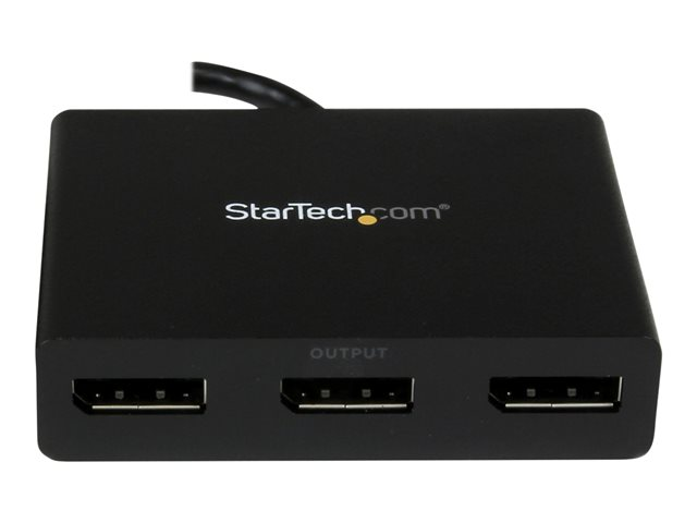 This MST hub lets you connect three monitors to your DisplayPort (DP) 1.2 equipped Windows laptop or desktop. The newest generations of computers are more portable than ever, which often means that you're left with fewer video outputs and smaller integrated screens. This MST hub solves both of these problems by letting you connect three additional displays to your computer, which makes multitasking much easier. With the MST hub, you can use DisplayPort video adapters and cable adapters that enable you to connect HDMI, VGA or DVI displays. This ensures your MST hub will be compatible with virtually any television, monitor or projector. This MST hub is VESA and DisplayPort certified to support DP 1.2 enabled systems, for seamless integration with your existing video equipment. Using the MST hub, you can extend your desktop onto additional monitors and stream independent content to each display giving you the freedom to multitask and increase your productivity. You can also mirror the same image onto multiple displays for remote viewing applications such as digital signage. MST technology uses your existing video card to minimize the use of system resources while delivering Ultra HD 4K resolutions. This unprecedented performance makes MST perfect for high-resolution applications such as graphic design, gaming and medical imaging. Note: When using a DisplayPort 1.1 video card the MSTDP123DP will act as splitter, automatically mirroring your video source across all displays. Resolution limitations apply. Note: MST shares 21.6 Gbps across all attached displays. Higher resolutions can restrict the available bandwidth with the remaining ports. Certain graphics adapters have limited MST support and will only output to three displays in total. If more than three monitors are attached the fourth will be disabled.