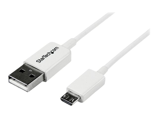 Charge or sync your Micro USB devices over longer distances, with this high-quality white USB 2.0 replacement cable. The USBPAUB2MW 2m White USB to Micro USB Cable features thin USB connector moldings and provides a simpler connection between your Micro USB 2.0 mobile devices (smartphones, digital cameras, Tablet PC devices, portable hard drives, etc.) and your PC or Mac computer, for everyday tasks such as charging, data synchronization or file transfers.
