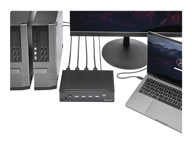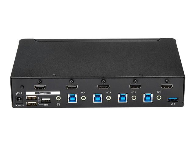Med denna USB 3.0 HDMI KVM-switch med 4 portar kan du kontrollera fyra HDMI-datorer med en enda uppsättning av skärm, tangentbord och mus. KVM:en har dessutom 3,5 mm audio och en inbyggd USB 3.0-hubb med 3 portar. Enkel och kostnadseffektiv delning av USB 3.0-tillägg Denna KVM-switch har en inbyggd USB 3.0-hubb med 3 portar som är separat från ditt HID-tangentbord och -mus så att du kan dela USB-tillägg mellan varje ansluten dator och slippa kostnaden av separat utrustning. USB 3.0-hubben växlar dina anslutna USB-enheter automatiskt till vald dator så att du slipper bekymret med att koppla ifrån och återansluta dina tillägg. Med stöd för USB 3.0 kan du uppnå dataöverföringshastigheter på upp till 5 Gbps, för att garantera felfri prestanda för dina USB-tillägg - perfekt för att snabbt föra över data till externa USB 3.0-hårddiskar. HD-bildkvalitet Denna HDMI KVM-switch med 4 portar har stöd för HD-upplösningar i 1080p och har förmågan att kristallklart driva stora HDMI-skärmar och är därför idealisk för grafiska tillämpningar som kräver videoupplösningar i 1920x1080. Total multimedia-kontroll KVM-switchen har 3,5 mm aux-audioportar som låter dig dela oberoende analog audio från varje ansluten dator, med din uppsättning av högtalare. Oberoende audio, tillsammans med 1080p HDMI-video, ger dig total multimedia-kontroll mellan olika datorer gör denna KVM perfekt för kreativa professionella tillämpningar som till exempel video- och ljud-design eller redigering. SV431HDU3A2 täcks av StarTech.coms 2-årsgaranti och gratis livstidsgaranti på teknisk support.